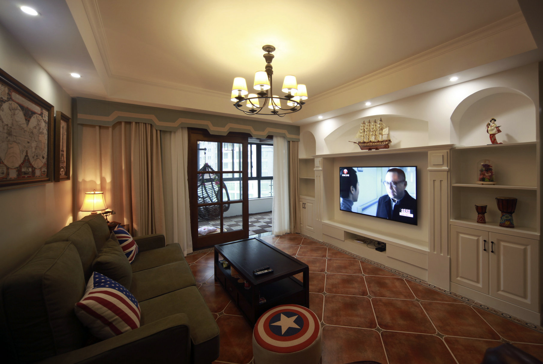 风格上定义为美式乡村,外观和用料仍保持自然、淳朴的风格,客厅电视背景墙是本案的亮点所在,再配以拱形的柜体收纳空间,点缀上布艺沙发和斑斓时钟。就整体而言,传达了纯真、休闲、多功能的设计思想,让家庭成为释放压力和解放心灵的净土。