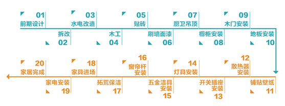 前期设计→拆改→水电改造→木工→贴砖→刷墙面漆→厨卫吊顶→橱柜安装→木门安装→地板安装→铺贴壁纸→散热器安装→开关插座安装→灯具安装→五金洁具安装→窗帘杆安装→拓荒保洁→家具进场→家电安装→家居完成。