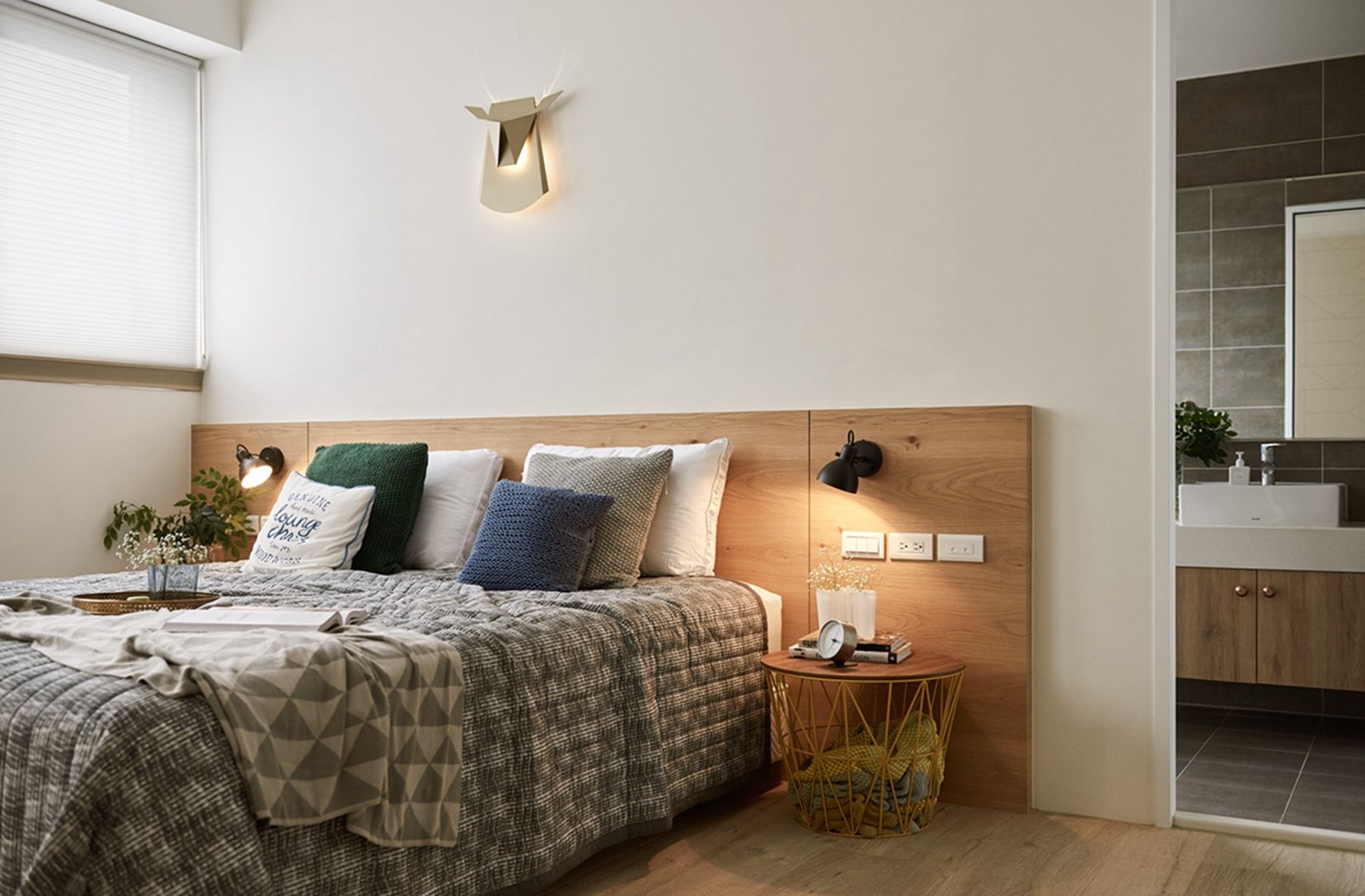 2. 床头背景墙是卧室设计中的重头戏。设计上更多地运用了点、线、面等要素形式美的基本原则,使造型和谐统一而富于变化。